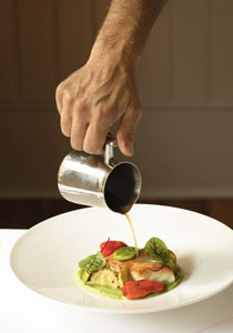 Wanting to put a fresh spin on the “death by chocolate” dessert concept, Cardona created A Study of Vanilla, building myriad layers of vanilla: a custard, a Valrhona Opalys mousse, vanilla wafers, and finally, tricking the eye with a stem of tempered dark chocolate shaped like a vanilla bean. “That's the artist in her,” notes Collins.