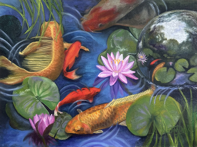 Accuracy and realism are central to her process. She studies subjects carefully in their natural settings, ensuring every detail is true to life. Cedar Waxwings, hummingbirds, and koi fish appear exactly as they exist. She even plants flowers to attract hummingbirds for firsthand observation.