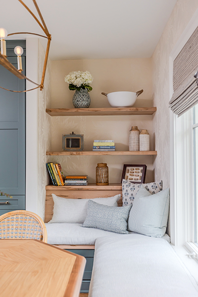 The PRD Custom Homes team reimagined the layout of the unusually shaped kitchen, transforming it into an eat-in space that functions effortlessly for everyday meals and easily converts into a welcoming dining area for entertaining. Irizarry paired a custom octagonal table designed for four, with the ability to expand and seat up to 10 guests, with a built-in bench that provides flexible additional seating. The thoughtful configuration delivers exactly what the homeowners were seeking: a kitchen that works beautifully day to day while seamlessly accommodating guests when the occasion calls for it.