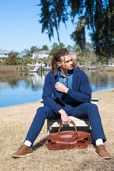 Southern Tide Intercostal pant in true navy, $148, Southern Tide Driver ST Geo polo in dress blue, $98, Southern Tide Brookview performance jacket in dress blue, $198, Italian braided belt in camel, $105, Cavalier No. 96 Vintage Bag, $1,295; all from M. Dumas & Sons, 294 King St, Charleston. Model’s own shoes.