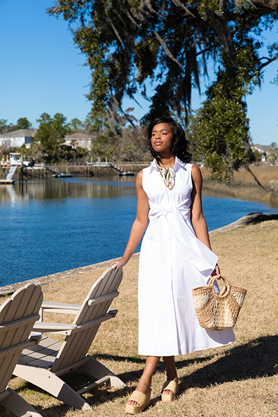 Santorini Beaumont dress in white, $119.99, Cancun tote, $59.99, Dailah bracelet Set, $9.99, Lucia Heel shoe, $76.99; all at E. Blackhurst, 145 King St, Charleston. Scarf necklace in beige, $30; at Paisley of Daniel Island, 194 Seven Farms Drive, Daniel Island.