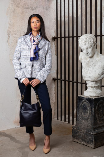 St. Germain blazer in lavender tweed, $195, Copley satin shirt in mist, $108, Jackie pants in navy, $98, Marine pink iron gate scarf, $68, bucket leather bag in navy, $389; all at Jean-Pierre Klifa, 214 King St, Charleston. Model’s own shoes.