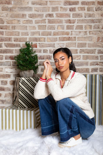 Charlotte cable sweater, $145, Olivia wide leg FDJ jeans in medium blue, $144, J. Melissa Designs gold criss cross earrings, $52, Blowfish Malibu Buenos shoes, $55; all at Paisley of Daniel Island, 194 Seven Farms Drive, Daniel Island.