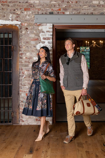 On him: M. Dumas seasonal shirt in burgundy, $125, Duck Head dark khaki pants, $115, Barbour Bradford gilet, $190, Epos Leggenda sunglasses $300, Shinola watch, $1,550, Cavalier 1 No. 96 Ghurka bag in khaki twill-vintage chestnut leather, $1,295, Barbour mini umbrella in tartan $70; all at M. Dumas & Sons, 294 King St, Charleston. Model’s own shoes.
