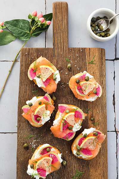 5. Drape smoked salmon on top. Layer with radish slices and tuck in a thin slice of lemon.
