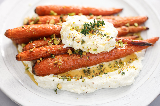 6. Spread whipped ricotta onto a serving platter. Top with roasted carrots.