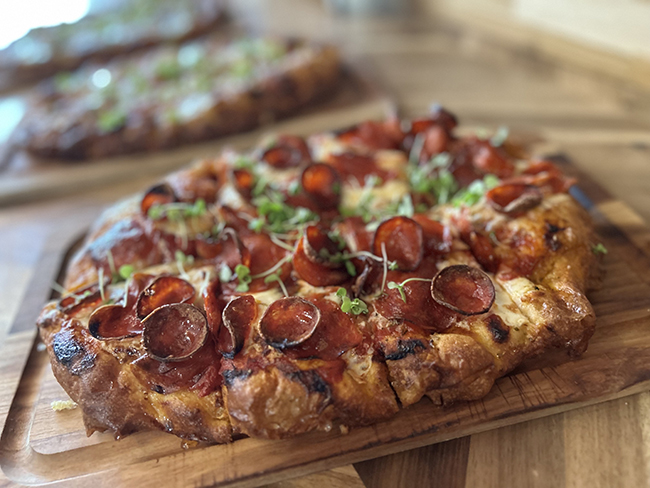 A favorite of the busy lunchtime crowd is their Pinsa pizzas—a Talucci’s signature, where their housemade dough uses a proprietary blend of imported Italian flours and a long fermentation process. “They are unique in that they are lighter, crispier, and more digestible than traditional pizza—making them perfect for lunch,” says Jacklyn Talucci, who owns the restaurant with her husband and chef, Charles Talucci. “It’s flavorful without being heavy, so guests can enjoy a satisfying meal and still get back to their day. Many guests rotate through the pizza options because they are filling but never overwhelming.”